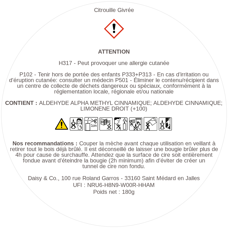 - Bougie de 180g avec sa mèche en bois pour environ 40h de brûlage.
