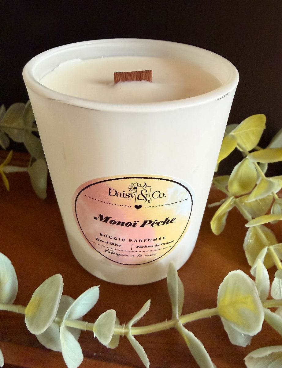 Plongez dans un monde de douceur avec la Bougie Monoï Pêche qui associe des senteurs à la fois fruitées et florales.