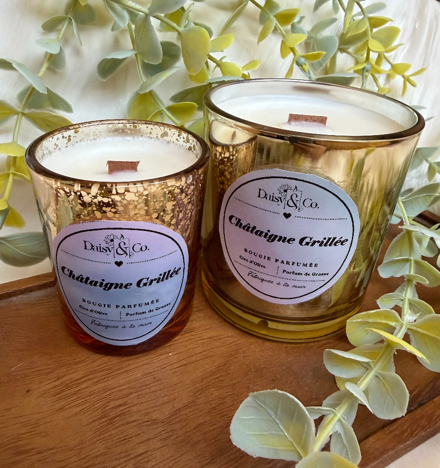 Nos bougies sont déclinées en deux version : 80g et 180g. Elles sont délicatement coulées à la main avec une cire d'Olive 100% végétale et parfumées avec des fragrances de qualité provenant de Grasse,