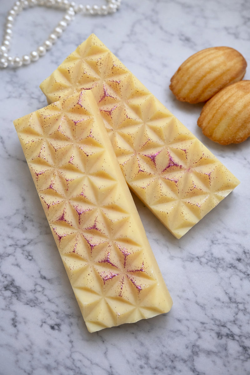 Chaque Tablette a été méticuleusement coulée à la main et pèse environ 45g. Fabriquée avec une cire d'Olive et des fragrance de Grasse.
