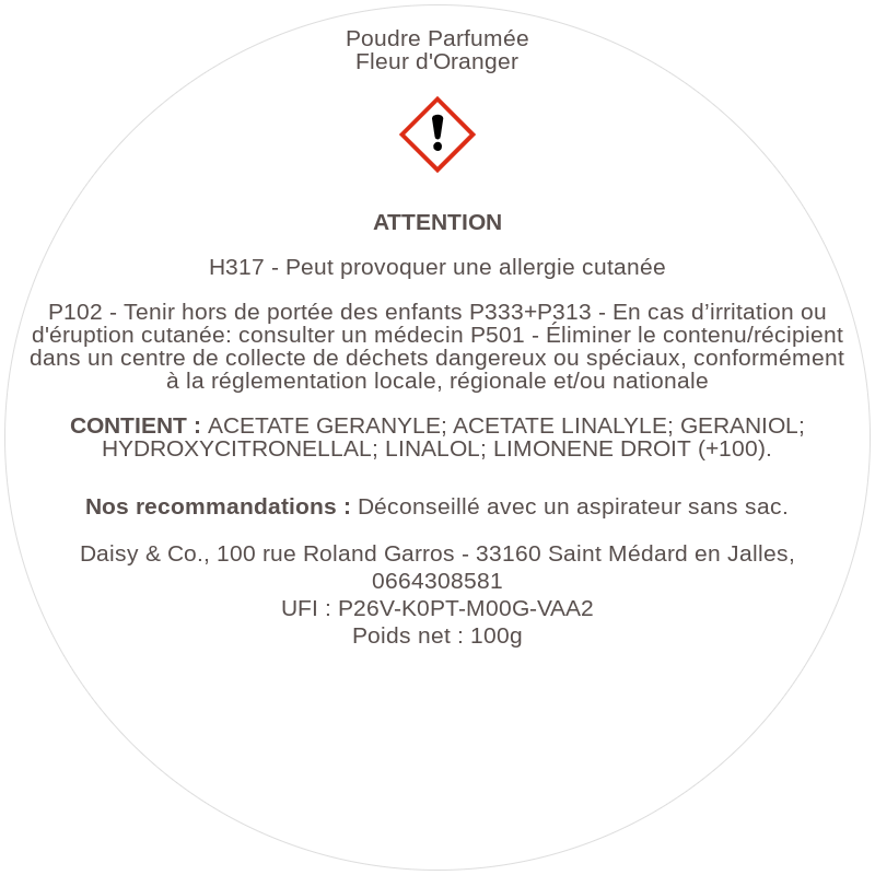 Notre Poudre Parfumée est la solution pour parfumer agréablement votre maison, de plusieurs manières possibles ! Finie les mauvaises odeurs pour laisser place à une douce et agréable senteur de Fleur d'Oranger.